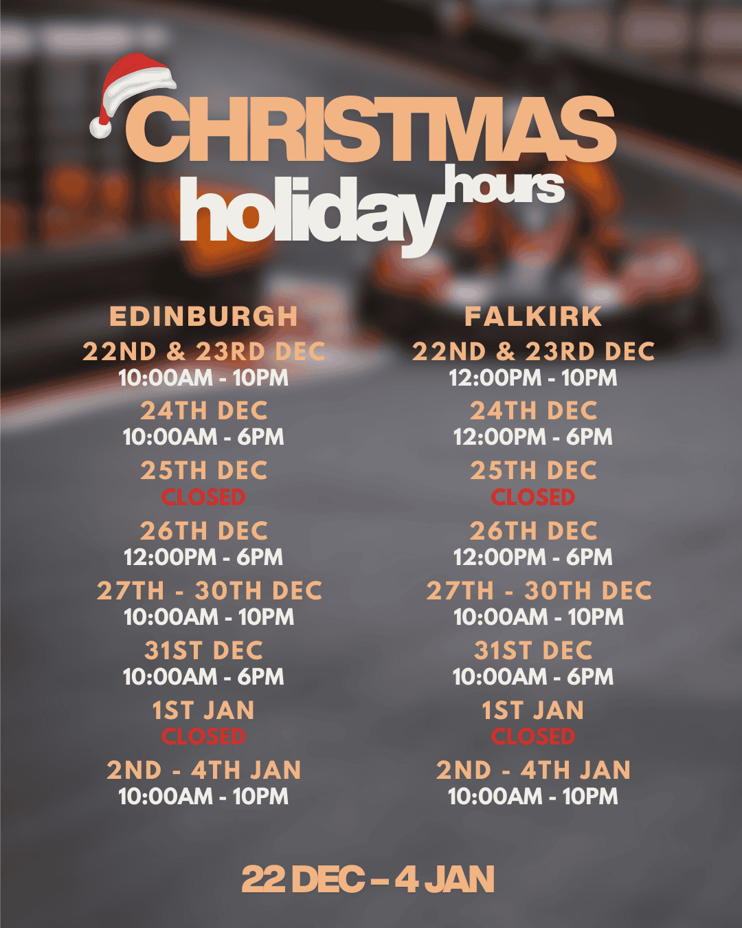 Please note that when we reopen the Edinburgh centre will only feature Senior Karts, and will therefore be strictly age 12 and over (ages 12+ sessions will be added to our online booking early October).